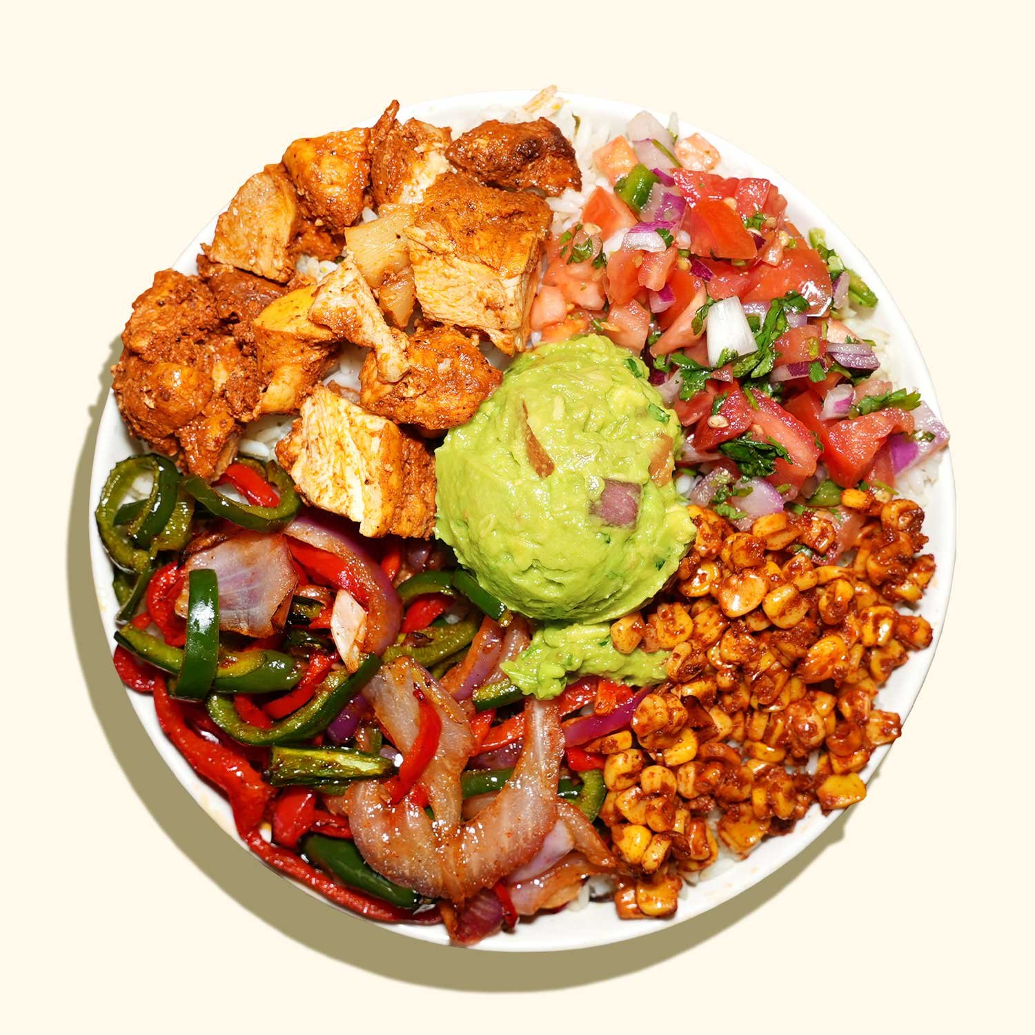 Rice, antibiotic-free chicken al pastor, guacamole, fajita veggies, fire roasted corn, pico de gallo, garlic chipotle crema